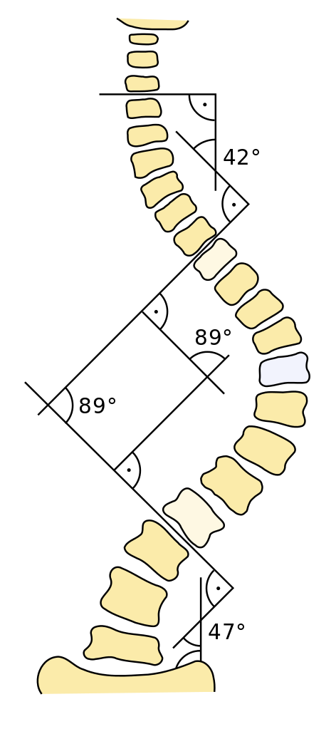 x-ray상 cobb angle을 측정하여 각도를 파악하는데 가장 만곡 각이 큰 척추체를 기준으로 만곡 된 위 끝 척추의 골단판과 아래 끝 척추의 하 골단판이 이루는 각을 측정합니다.