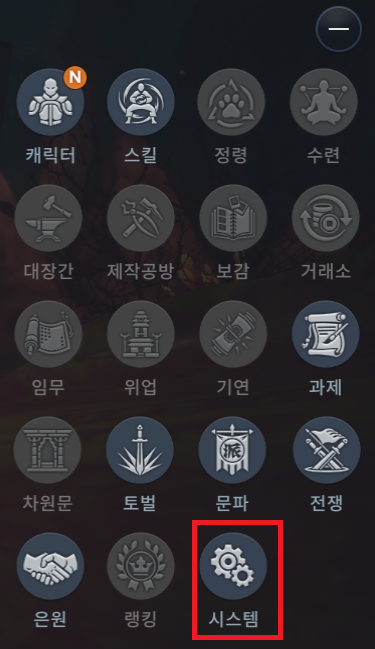 게임 접속 후 오른쪽 위의 메뉴에서 시스템을 클릭합니다.