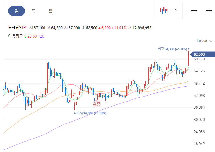 두산퓨얼셀, 블랙록 지분 확대에 '최고가', 11% 오른 6만2500원