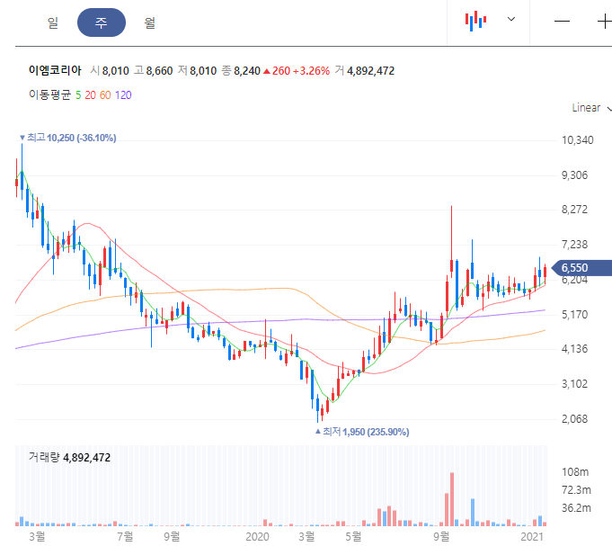 주가 차트를 살펴보시면 최근 흐름을 횡보하는 것을 보실 수 있습니다. 2019년도의 최고가를 아직 다시 갱신하지는 못한상태입니다. 정부차원에서 수소충전소를 구축한다는 발표에 이어서 조금씩 상승하는 모습은 보이고 있습니다. 그린뉴딜 정책의 일환으로 2022년까지 수소충전소를 310개를 만들 것을 목표로 하고 있습니다. 이엠코리아 주가 분석 및 관련 소식에 대해서 포스팅 제일 하단 부위에 링크로 정리해두었으니 참고하시면 좋겠습니다.