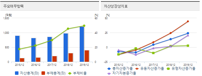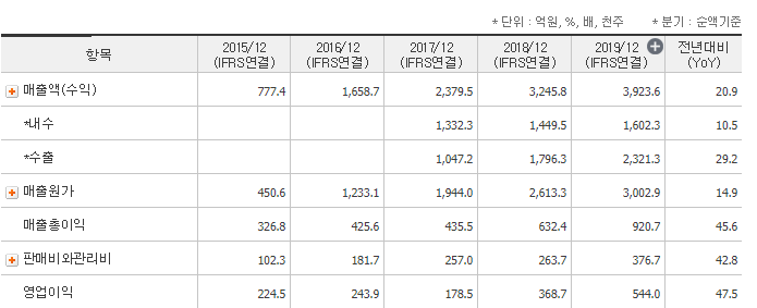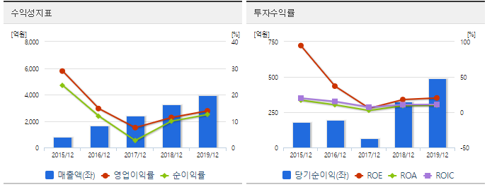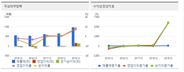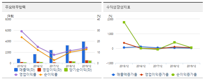 매출액은 점차 증가하는 추세이고 영업이익은 2019년 12월 기준 전년대비 47.5% 증가율, 당기순이익은 전년대비 51.5% 증가율을 보여주고 있습니다.