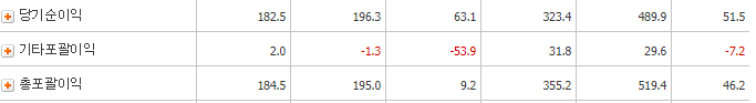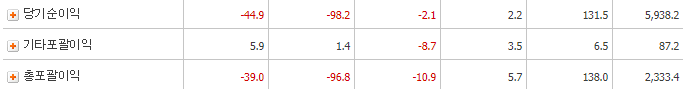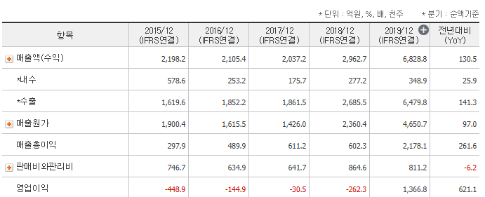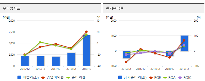 매출액은 증가하는 모습이고 영업이익은 전년대비 6,045% 증가율이 나타나며 당기순이익은 전년대비 5,938%로 엄청난 증가가 있었습니다.