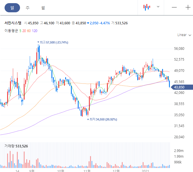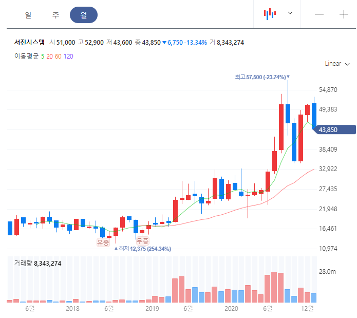 PER은 약 233배, PBR은 약 12배로 높은 상태입니다. 아래에서 차트를 살펴보시겠습니다.