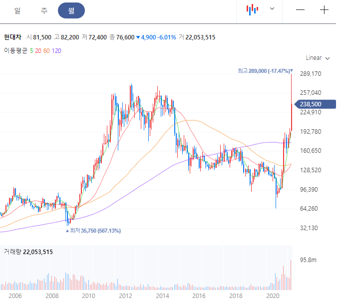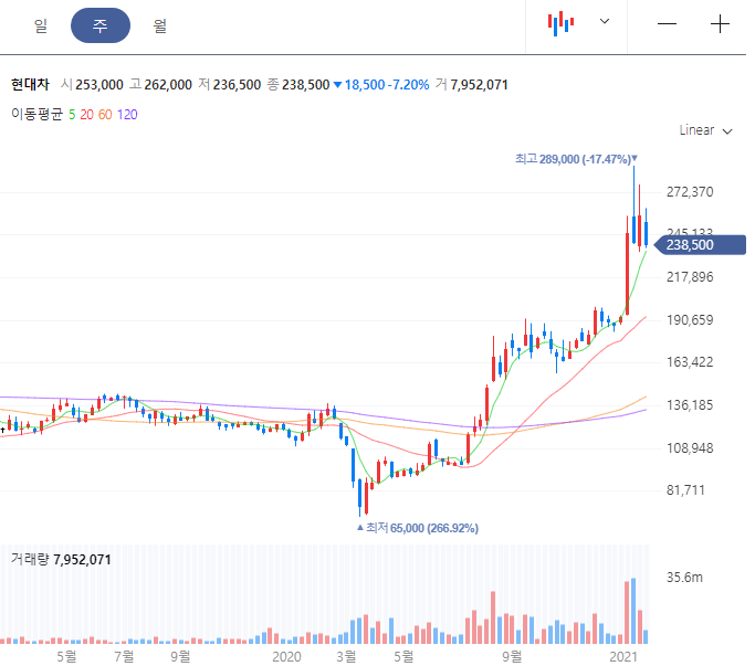 이제부터 현대자동차 차트를 확인해보겠습니다.