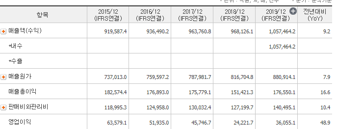 매출액은 2019년 12월 기준 전년대비 9.2% 상승률을 보였고 지속적으로 흑자를 보이고 있습니다. 영업이익은 전년대비 약 48% 증가율, 당기순이익은 약 93% 증가율을 보이고 있습니다.