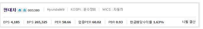 현대자동차의 PER은 약 58.66배로 업종 PER 평균 60.02 보다 약간 낮은 수치이며 PBR은 0.93배로 나타나도 있습니다. PER, PBR, ROE 등 관련 재무제표 보는 법에 대해 궁금하신 분은 아래 링크를 보시면 도움이 되실 것 같습니다.