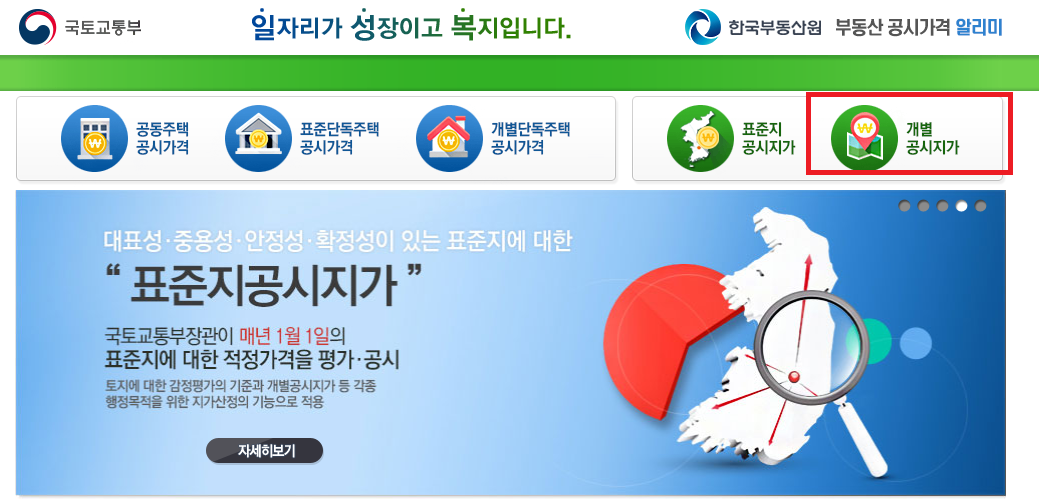 이후 아래 화면에서는 오른쪽 상단 부분에 개별공시지가 탭을 클릭합니다.