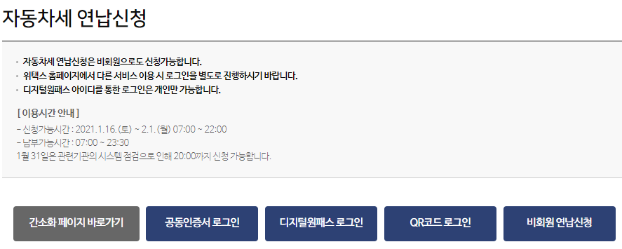 인증서가 없는 분들도 비회원 연납신청을 통해서 신청하실 수 있기 때문에 편리합니다. 이후 화면에서는 차량정보와 개인정보들을 입력하시면 간단히 자동차세 납부를 신청하실 수 있습니다. 아쉽게도 1차 신청시기가 지나서 이 글을 보신 분들은 다음 회차 때 신청을 하시면 가능합니다. 기간이 지난 상태로 위택스 홈페이지로 들어가면 간소화 화면이 나오는 것이 아닌 위택스 홈페이지로 바로 접속이 되실 겁니다. 서울시 거주자 분들은 서울시 이택스에서 아래와 같이 신청하기 버튼을 누르시면 됩니다.