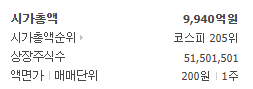 시가총액 9,940억 원, 시가총액 순위 코스피 205위에 해당합니다. 아래에서 최근 주가 흐름을 살펴보시겠습니다.