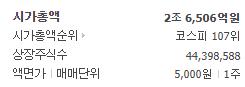 시가총액 약 2조 6,506억원, 시가총액 순위 코스피 107위 기업입니다. 아래에서 차트를 살펴보시겠습니다.