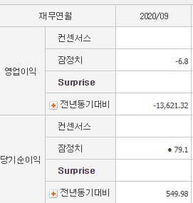 영업이익은 전년 동기 대비 -13621%, 당기순이익 549% 정도를 기록하고 있습니다.