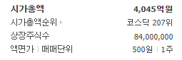 시가총액 4,045억 원, 시가총액 순위 코스닥 207위에 해당합니다. 아래에서 차트를 확인해보시겠습니다.