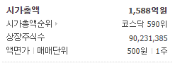 시가총액 약 1,588억 원, 시가총액 순위 코스닥 590위 기업입니다. 아래에서 주가 차트 흐름 확인해보시겠습니다.