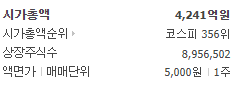 시가총액 4241억원, 시가총액순위 코스피 356위 기업입니다. 아래에서 주가 차트 흐름을 보시겠습니다.