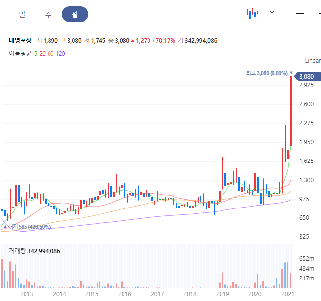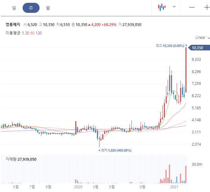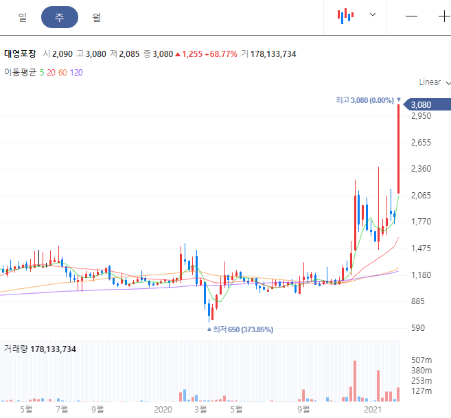 보시다시피 쿠팡상장소식과 함께 엄청난 급등을 보였습니다. 설 연휴 기간이 겹친것도 물론 한 몫 하였습니다. 앞으로 박스 대란 말고도 이러한 택배 관련한 사업이 코로나 여파로 어느정도 호재가 있는 상태이기 때문에 조정이 있다고 하더라도 조금더 상승할 여력은 있지 않을까 조심스럽게 살펴볼수 있습니다.