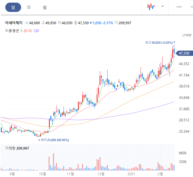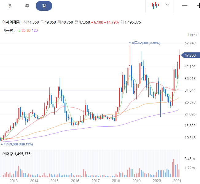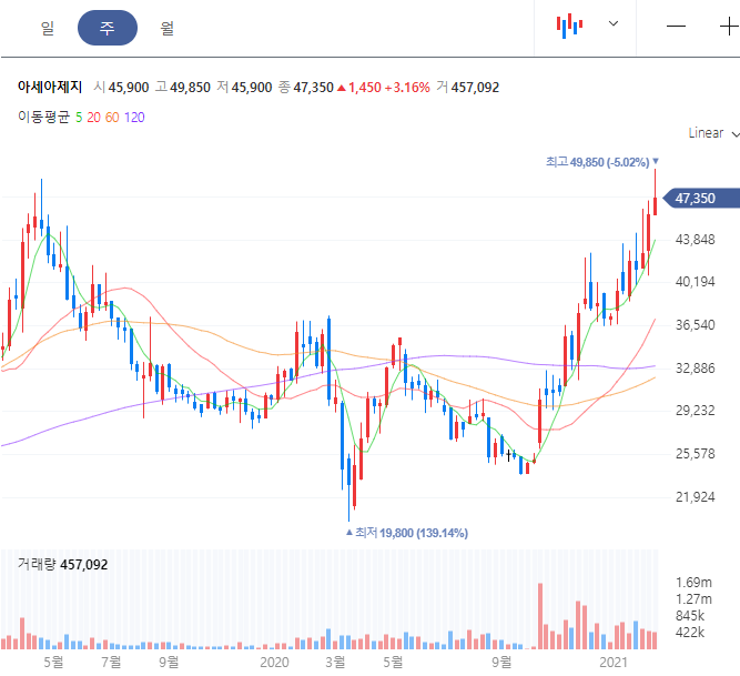 2018년의 최고가 52000원은 아직 다시 갱신하지는 못했습니다. 하지만 최근 흐름을 보면 지속적인 우상향그래프를 그려주면서 차트 그래프 상으로는 조금 기대가 되는 안정적인 모습입니다.