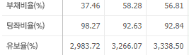 부채비율은 약 56%, 당좌비율 약 92%, 유보울은 3338%를 보여주고 있는 재정적으로 안정적인 모습입니다.