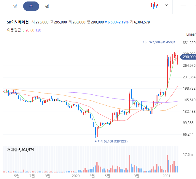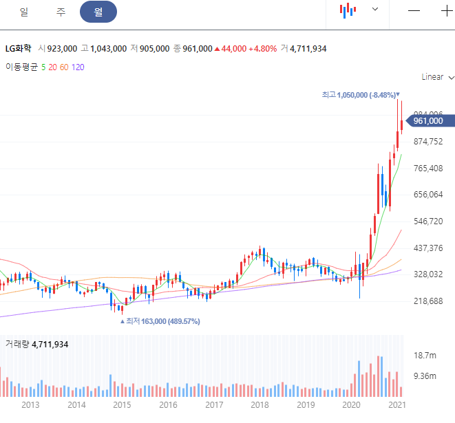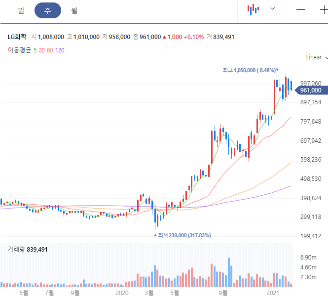 LG화학 또한 급등을 지속적으로 보이면서 엄청난 상승세입니다. 최고가 1,050,000원을 갱신하였고 이후로는 조정의 모습이지만 여력은 있다고 봅니다. SK이노베이션과의 배터리 전쟁에서 승리하면서 주가 상승의 호재로 작용하였습니다. 관련 소식과 분석에 도움되는 정보들을 포스팅 하단 부위에 링크를 정리해두었습니다.