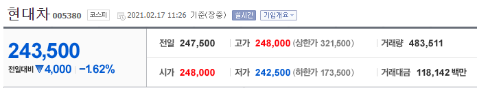 현대차 또한 너무나 유명한 대기업이죠. 주가는 기아차와 비슷한 모양으로 나타나고 있는 상태로 현대차 또한 애플카 협력 소식이 무산되면서 위기가 있었지만 회복하는 모습입니다. 자세한 내용은 아래 링크를 참조하시면 도움이 될것 같습니다.