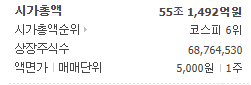 시가총액 55조 1492억원, 시가총액순위 코스피 6위입니다.