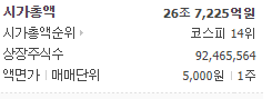 시가총액 26조 7225억원이며 시가총액순위 코스피 14위의 기업입니다.
