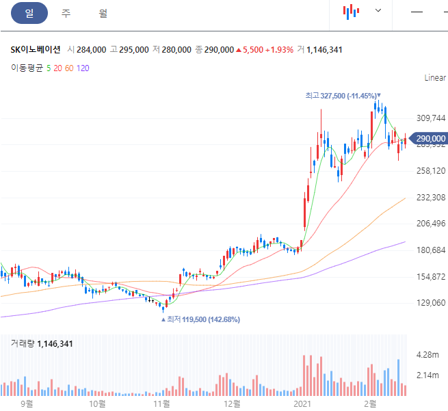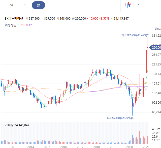 전기차 관련주는 SK이노베이션을 빠뜨릴 수는 없습니다. 석유와 화학사업부문 사업을 하고 있으며 전기차에 필수적인 배터리 사업을 확장하고 있습니다.