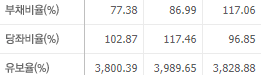 부채비율은 약 117%, 당좌비율 약 96%, 유보율은 3828%로 준수한 대기업의 재정 모습입니다.