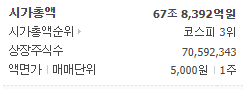 시가총액 67조 8392억원, 시가총액순위 코스피 3위에 해당하는 회사입니다.