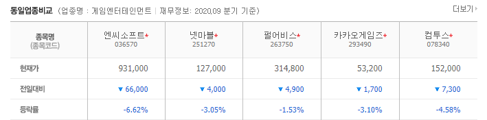 관련 법안 소식과 함께 게임회사들의 주가는 모두 하락을 나타냈습니다. 그중에서는 엔씨소프트가 가장 큰 폭인 약 -6.62% 하락을 보였습니다. 아무래도 확률형 아이템에 의한 매출이 엄청나게 큰 리니지 게임이기 때문에 주주들의 매도로 이어지지 않았나 싶습니다. 아래에서는 동일 업종에서 주가 변화를 보실 수 있습니다.