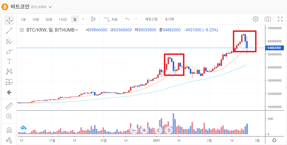 물론 이것은 사람들의 경험적인 생각일 뿐 가겨은 어디로 튈지 모르기 때문에 조정의 기준은 없습니다. 5000만원선을 지켜낸 것은 일단 다행인 점이라고 생각합니다. 현재 2일 동안의 사태가 일종의 개미 털기이고 이번주내로 다시 상승곡선을 보여줄 것이라는 기대감으로 버티시는 분들도 있습니다. 현재 그래프 모양 자체는 2021년 1월 때 며칠간 하락 후 다시 상승곡선을 그리게 되는 것과 유사합니다. 아래에 표시한 부분입니다.