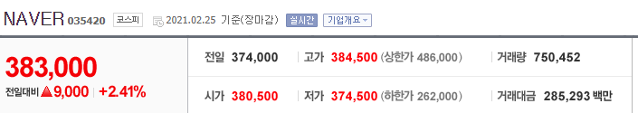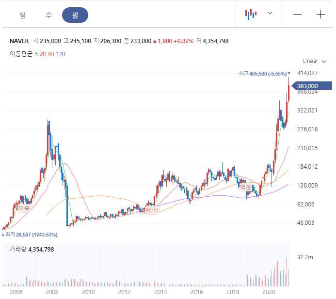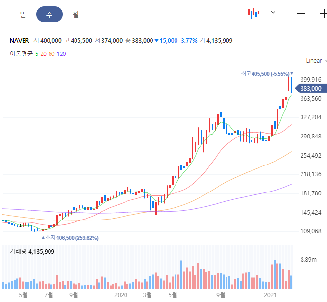 일봉차트를 먼저 보시면 최근 21년 2월에 최고가 405,5000원으로 40만 원을 돌파하였습니다. 이후로는 조금씩 하락을 보이며 38만 원 선에서 조정 중인 모양을 보실 수 있습니다.