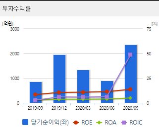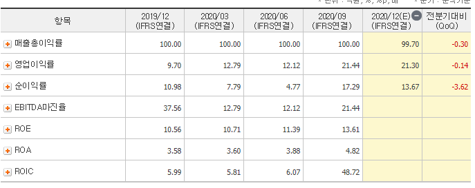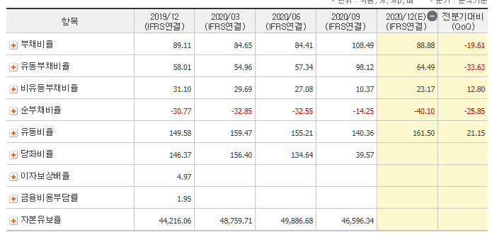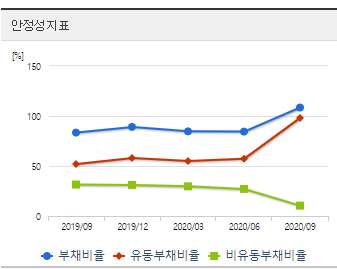 부채비율은 약 108%, 유동부채비율은 약 98%, 비유동부채 비율은 약 10%대입니다. 유동비율은 약 140%, 당좌비율 39%를 보이고 있으며 유보율은 46,596%로 나타납니다. 2020년 12월 기준의 최근 지표들에 대해서 아래에서 확인해보실 수 있습니다.