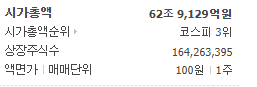 시가총액은 약 62조 9129억원, 시가총액 순위 코스피 3위의 기업입니다.