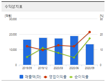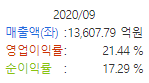 매출액은 약 1조 3607억원, 영업이익률은 21%, 순이익률은 17%로 나타나고 있습니다.