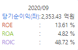 당기순이익은 약 2353억원, ROE는 약 13%로 준수합니다. 아래에서는 2020년 12월 최근 업데이트된 지표들을 보실 수 있습니다.