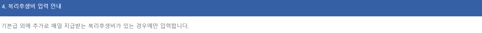 다음은 복리후생비 내용입니다. 식비, 숙박비, 교통비 등 금액과 지급방식, 매일 받고 있는 것인지 등을 입력해주세요.