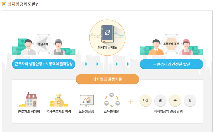 임금은 노,사간의 결정 과정에 의한 것이지만 국민의 최소한의 생활을 위해서 최저임금제도를 도입하여 국가가 최저 수준을 지정하게하는 제도입니다. 근로자의 생계비, 유사근로자의 임금, 노동생산성, 소득분배율 등을 고려하여 시급,일급,주급,월급으로 금액을 정하게 됩니다. 아래에서 최저임금위원회 공식 홈페이지에서 자세한 내용을 확인해보세요.