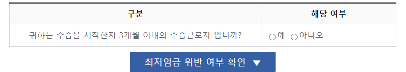 마지막으로는 수습근로자인지 여부를 확인해부시면 최저임금 계산이 완료됩니다.