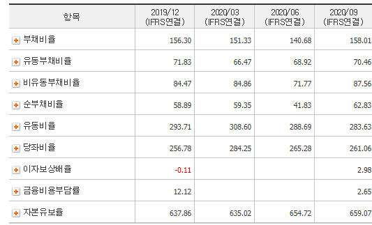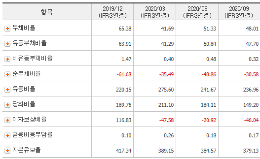 전년동기대비 영업이익 약 556%, 당기순이익 약 7476%로 엄청난 상승을 보이고 있습니다. 하단부위에서 재무제표 지표들을 확인해보시겠습니다.