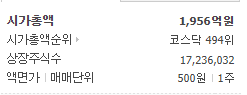시가총액은 1956억원, 시가총액순위 코스닥 494위 기업입니다.